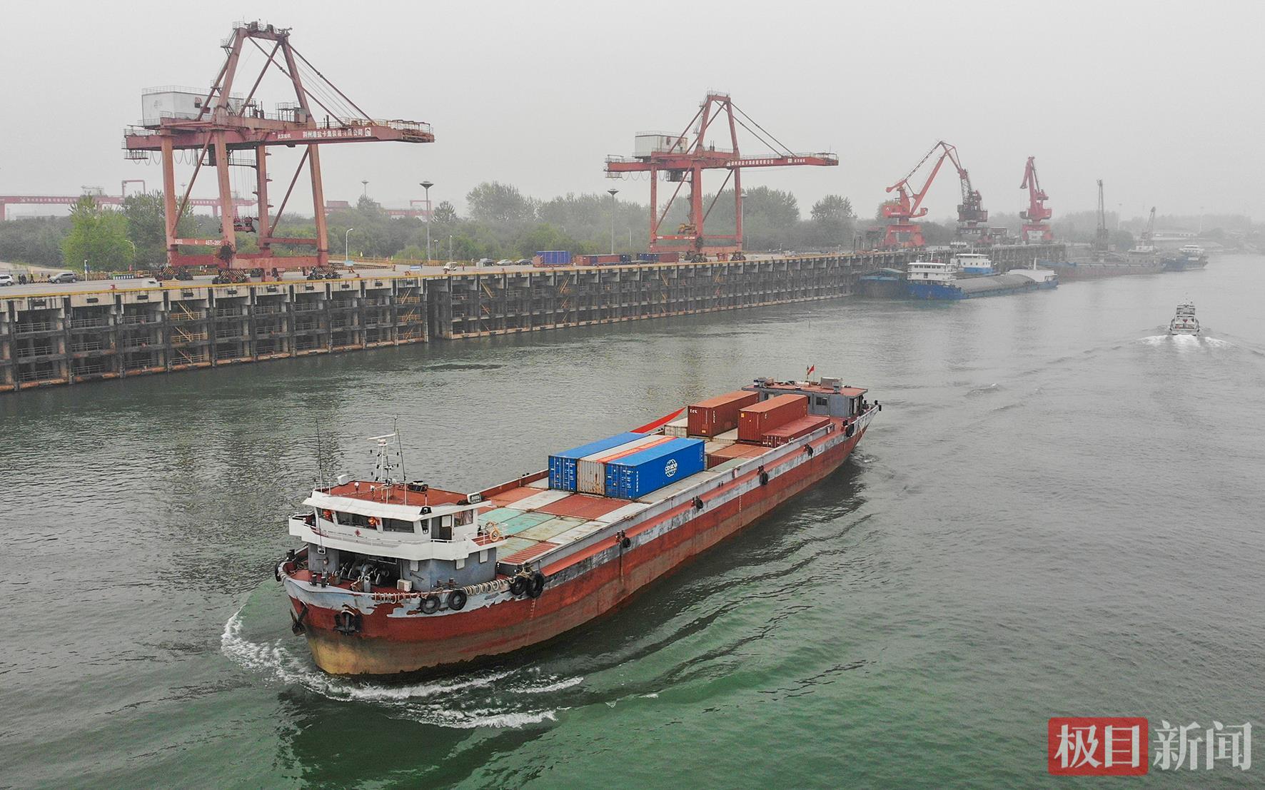 满载着100个标准集装箱的货轮正在驶离荆州港盐卡港区集装箱码头。(新闻记者 黄志刚 摄)