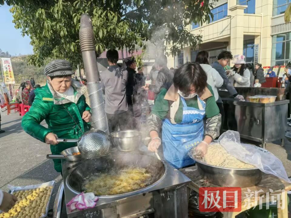 村民周静红的炸丸子摊位前更是围得水泄不通。40斤炸豆腐肉丸、300个炸苕圆,还有萝卜丝圆一出锅就卖断货,顾客只能排队等“炸”。“凌晨3点就起来剁肉了,没想到生意这么好!”周静红挤肉丸的手更加快了速度。