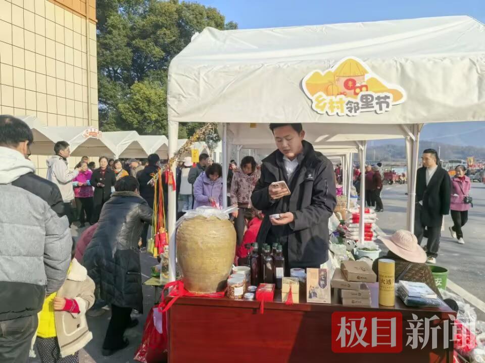 集市现场,20余个特色摊位依次排开,各色乡土好物让人目不暇接:干辣椒、干菜、干萝卜、干笋等农家干货制品风味醇厚;土鸭、豚、土鸡、土鸡蛋皆是农户放养;香猪肉、黄牛肉、跑山羊肉新鲜十足;再生稻、谷酒、山茶油等农产品也成了村民抢购的热门;还有艾叶制品、竹工艺品等地方特色好物琳琅满目。一个上午的功夫,8头香猪、2头土黄牛、4只烤全羊售罄,卖出400斤谷酒、400斤山茶油、500斤花生油等粮油产品,糖画摊位前更是人气爆棚,半日营收超1000元,甜香与童趣弥漫全场。