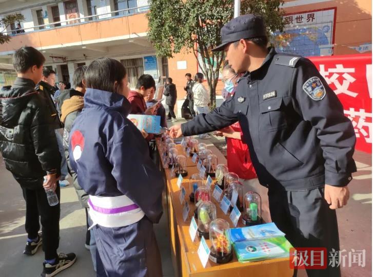 活动现场,禁毒反诈宣传专区前人头攒动、热闹非凡。民辅警与禁毒社工化身“安全宣传员”,带着精心准备的毒品仿真模型、主题宣传横幅、图文展板和宣传手册,用直观生动的方式向师生普及安全知识。