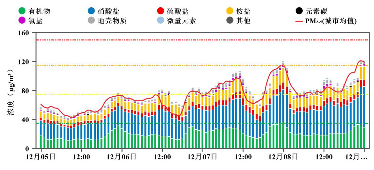 12月5日至9日8时武汉市超级站组分重构与PM2.5浓度值变化。