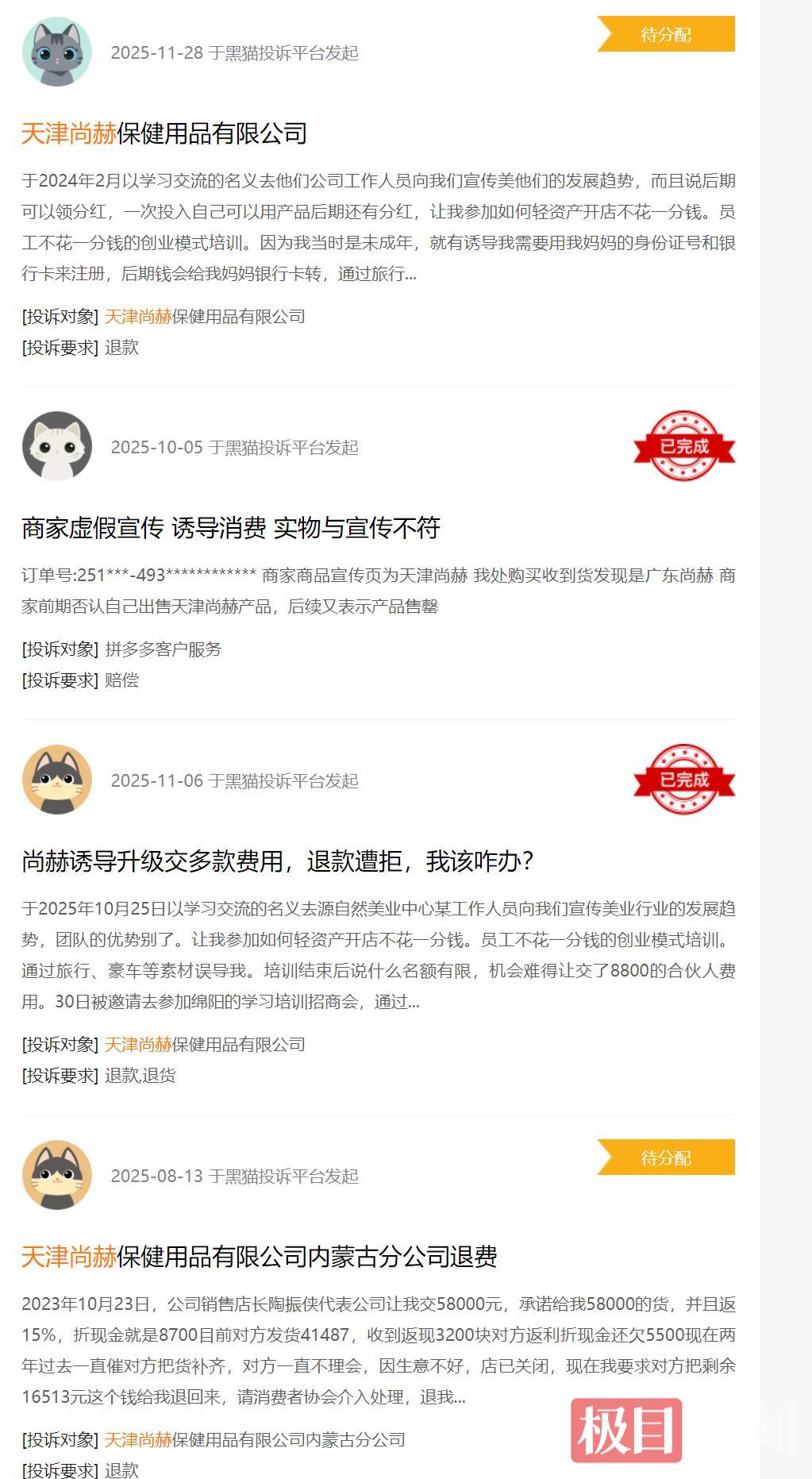 与此同时,在新浪黑猫平台上查询,新闻记者发现,不少网友反映天津尚赫保健品有限公司诱导消费者加盟,实则是买该公司的保健品和仪器,让消费者以检查为由将产品全部拆开,随后拒绝退货退款。还有部分网友称天津尚赫的工作人员进行推销宣传时,声称公司产品能治疗很多疾病,诱导消费者花费近10万元购买保健品,食后却伴随着头晕眼花、恶心难受等症状,余下的六七万元产品对方至今未发货且不予退款。
