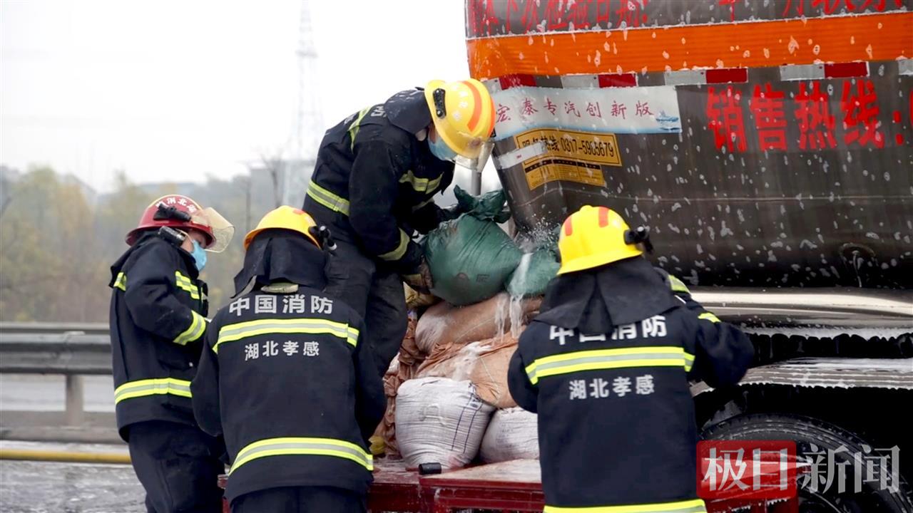 12月12日凌晨5时许,湖北省孝感市G107国道蔡上湾附近发生一起交通事故。一辆油罐车在路口等红灯时,被后方一辆半挂车追尾撞击,导致罐体破裂,汽油从裂缝处不断向外涌出。