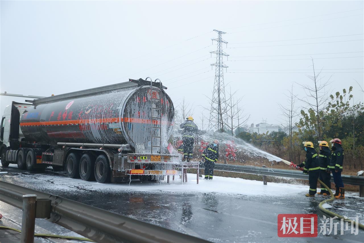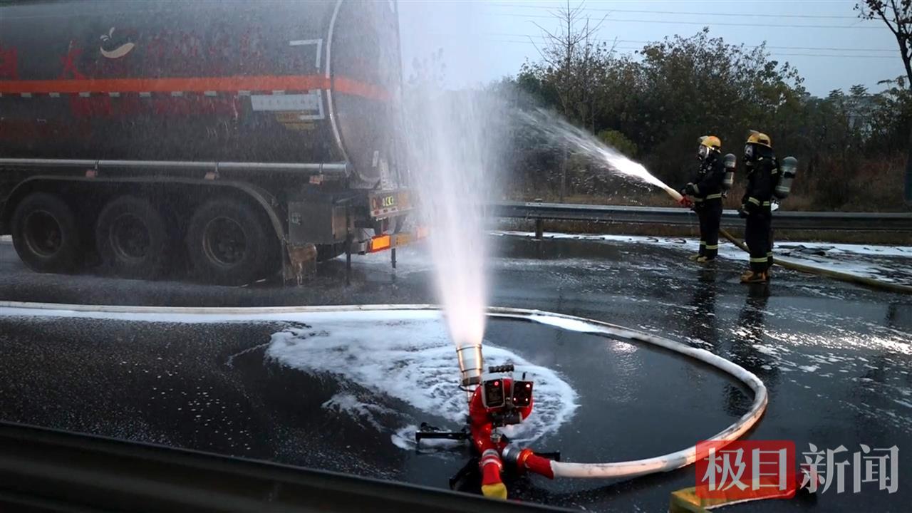 与此同时,消防员使用泡沫管枪对泄漏区、罐体及周边受污染地面进行覆盖和稀释,以抑制汽油挥发,防止形成爆炸性混合气体。
