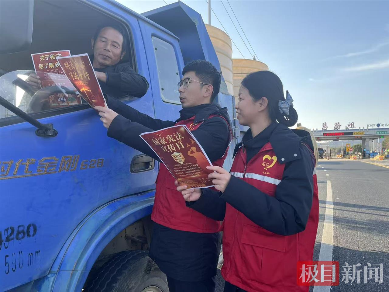 活动现场,总路咀管理所志愿小队在收费广场前搭起了宣传台,桌子上整整齐齐放着各类普法资料。工作人员充分利用好车辆过站的空隙,主动递上宣传册,还用大白话给司机们宣讲。宪法里有不少内容和行车安全、消费者权益息息相关。碰到有司机追问“绿通车”优惠的法律依据、ETC的通行规则,或是电子发票有没有法律保障这些实际问题,大伙儿也都一一耐心解答。