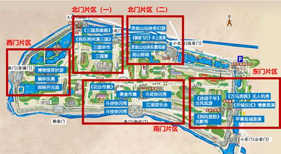 东门片区——以楚文化为核心载体,围绕护城河、金凤广场、寅宾门、张居正街进行打造。