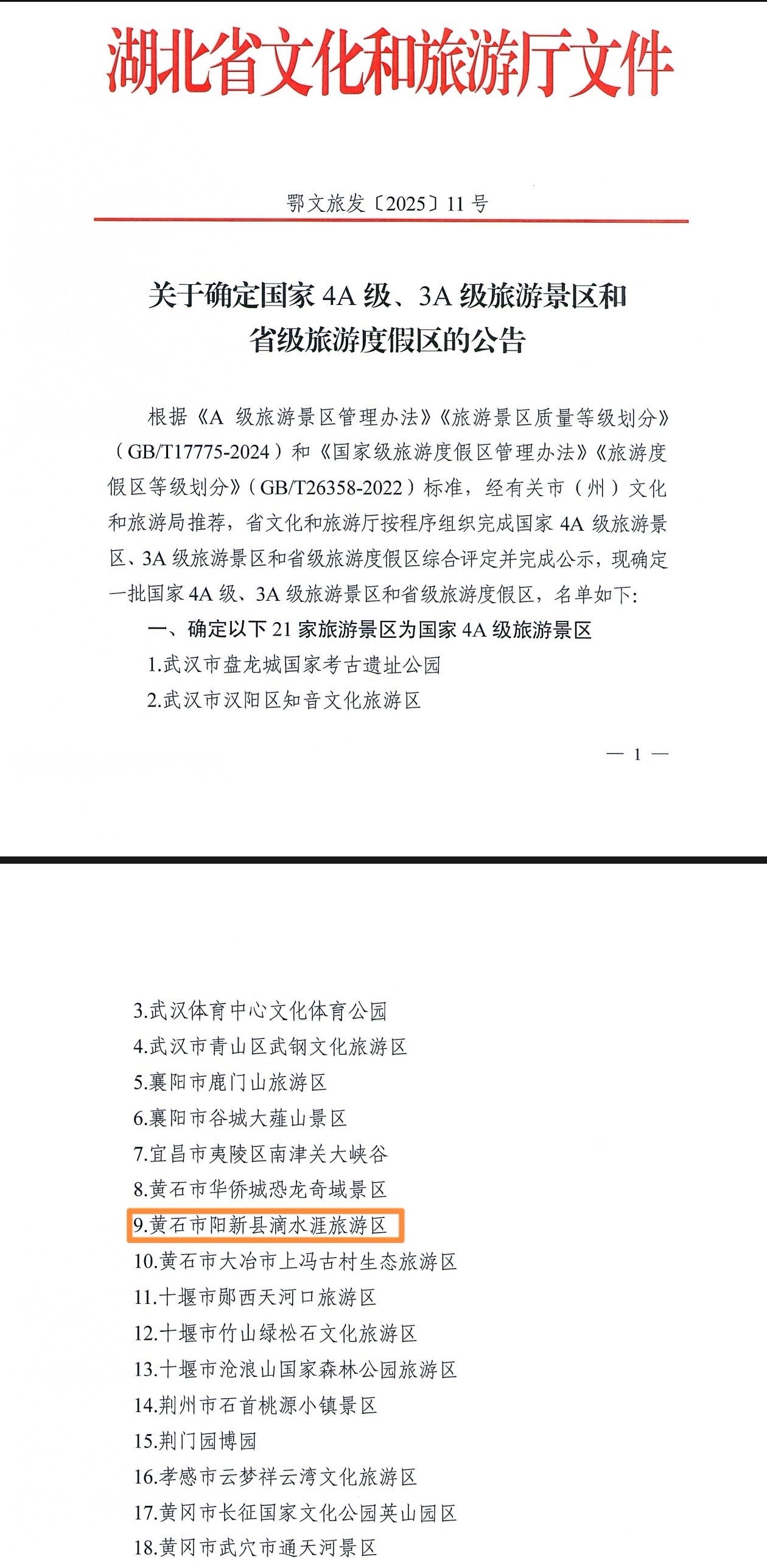 湖北日报客户端讯(通讯员范深傲、李霖)12月19日,湖北省文化和旅游厅发布关于确定21家旅游景区为国家4A级旅游景区的公告。其中,阳新县滴水涯旅游区成功入选,正式升级为国家4A级旅游景区!