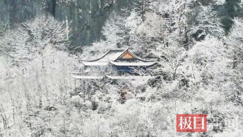 雪后的天柱山,核心景观被白雪全覆盖,几座岩柱宛如玉笋擎天,连接峰柱的石桥缠雪挂霜,更显雄奇壮观。山间林木缀满冰晶,雾凇与琼枝交相辉映,微风拂过便洒落细碎“银花”,步行其间,脚下积雪发出清脆的咯吱声,与空谷回响相映成趣。古建筑群落披雪而立,红墙与白雪相映,飞檐上的冰凌晶莹剔透,为这座千年福地添了几分静谧圣洁。
