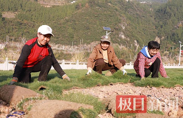 12月20日,巴东县沿渡河镇神农公园建设现场,工人们忙着铺设草坪、栽植绿化树,挖掘机挥舞长臂转运泥土,一派忙碌的建设景象。