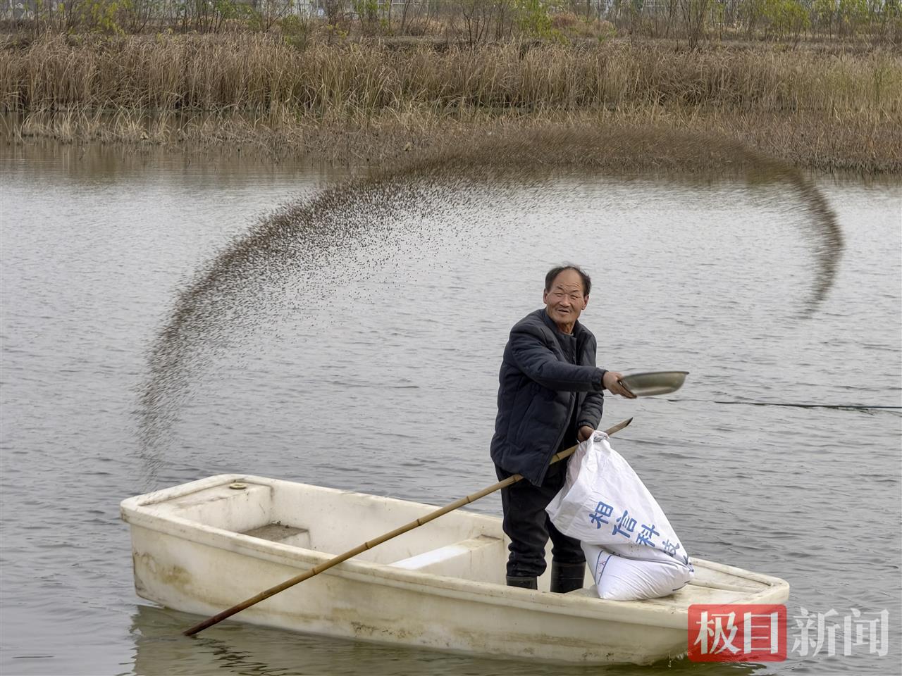 应城市义和镇柴咀村村民在承包的鱼塘投喂饲料 新闻通讯员朱艳摄
