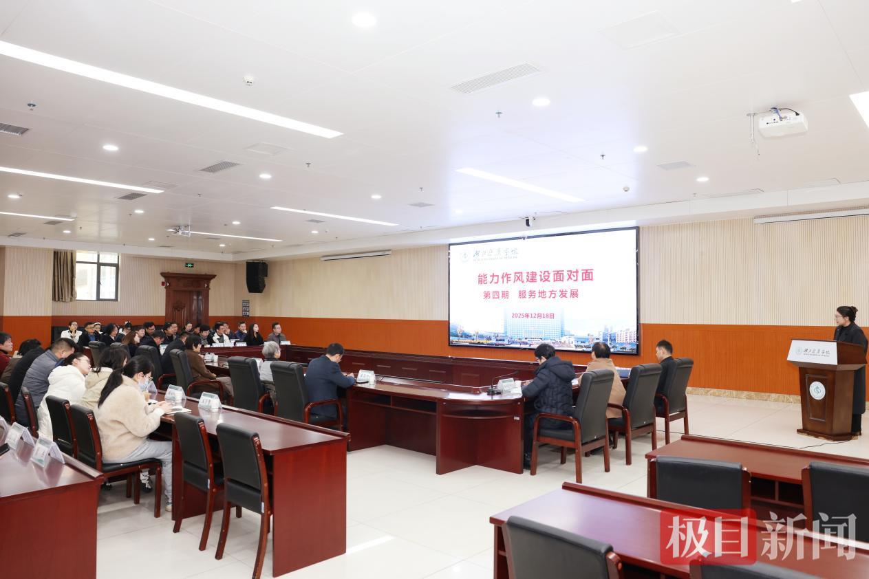 “科研成果转化如何更贴地?人才培养怎样对接区域需求?”12月18日,湖北医药学院科教楼一楼多功能厅内气氛热烈,“能力作风建设面对面”第四期活动聚焦“服务地方发展”主题,一场直击痛点、务实高效的“作风大考”正在进行。党委书记郑丹凤,党委常委、宣传部部长陈建龙,能力作风建设办公室成员、评议团成员及教师代表共50人齐聚现场,以“零距离”问政推动学校能力作风提质增效、服务地方效能升级。