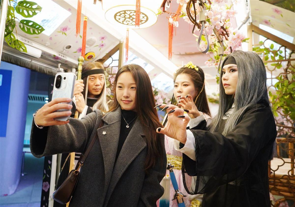 记者在襄阳东站公交站看到,“侠义襄阳欢迎您”的宣传语格外醒目,三辆装饰一新的武侠风主题公交车静静等候,驾驶员身着精致古装,扮相惟妙惟肖。