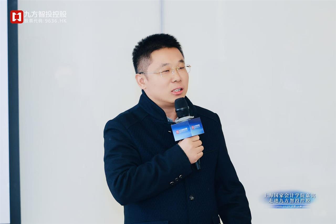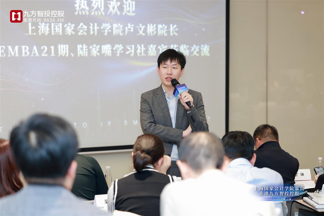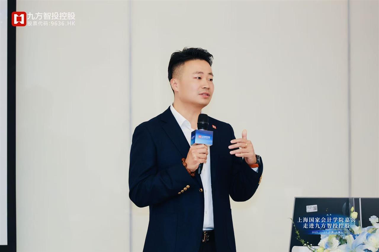 九方智投控股创始人、董事会主席兼CEO陈文彬首先致欢迎辞,对上海国家会计学院一行的到来表示热烈欢迎,并分享了九方智投控股的发展历程、核心业务及未来战略布局。“当前正处于科技赋能金融的黄金时代,希望以此次交流为契机,实现资源共享、优势互补,共同为金融行业高质量发展赋能。”陈文彬强调。