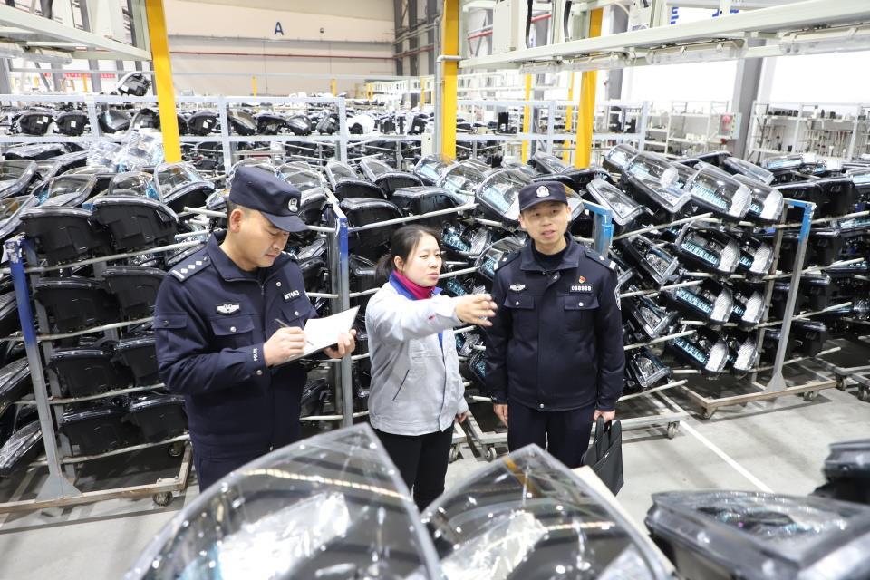 在企业生产车间,民警实地查看了车灯仓储、生产流水线等重点区域的安全管理状况,与企业工作人员深入交流,详细了解安全生产制度落实、安全设施配备及日常隐患排查等情况。针对检查中发现的安全防范细节问题,民警现场提出整改意见,手把手指导企业完善消防、物资存放等安全防范措施,督促企业将安全生产责任落实到每个环节。