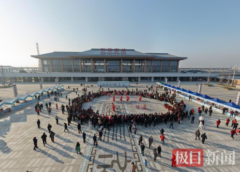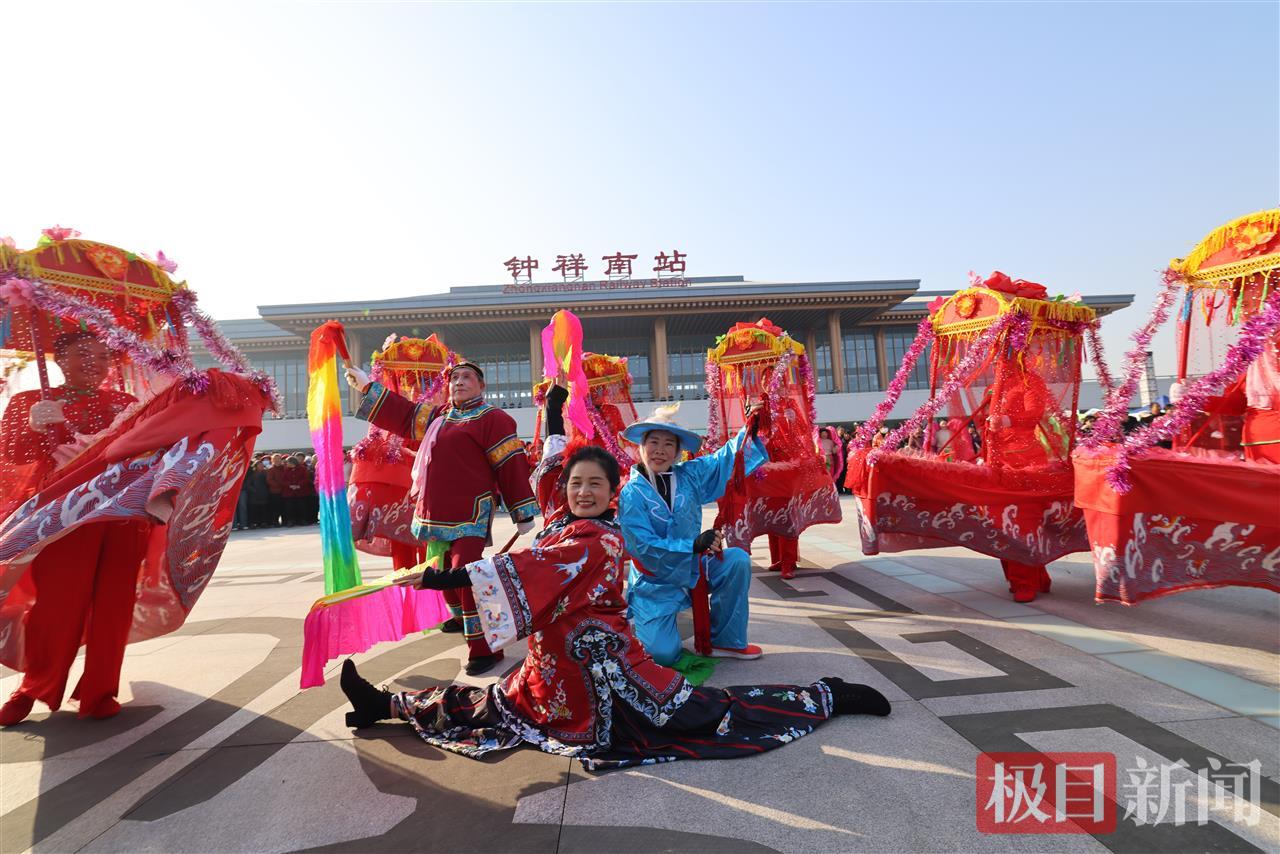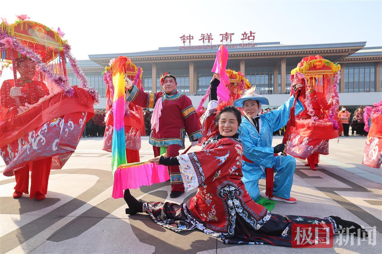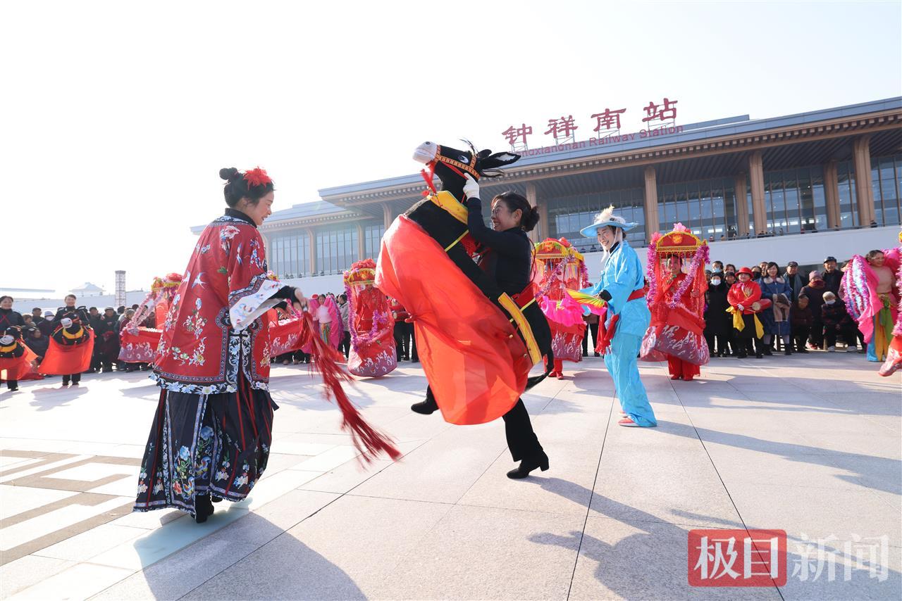在钟祥南站站前广场上,富有地方特色的“寿乡风物”文商旅市集展示了钟祥的物产与文旅魅力。附近的群众现场通过腰鼓队、采莲船、蚌壳精、拉犟驴、狮鼓舞等非遗节目的演出,展现喜悦的心情。