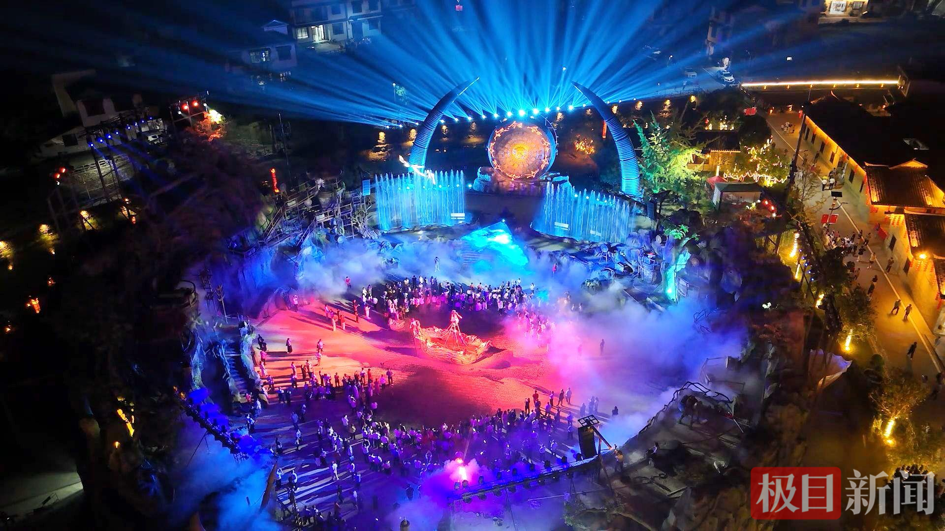 云歌绕梁,演绎千年迁徙;古街溢彩,升腾烟火气息;拍打舞欢腾,燃动静谧夜色……古瑶村实景剧场内,一场《瑶望千年·云歌》正在上演。灯光与山水交融,鼓声与风声共鸣,游客们沉浸于瑶族先民的迁徙史诗中。