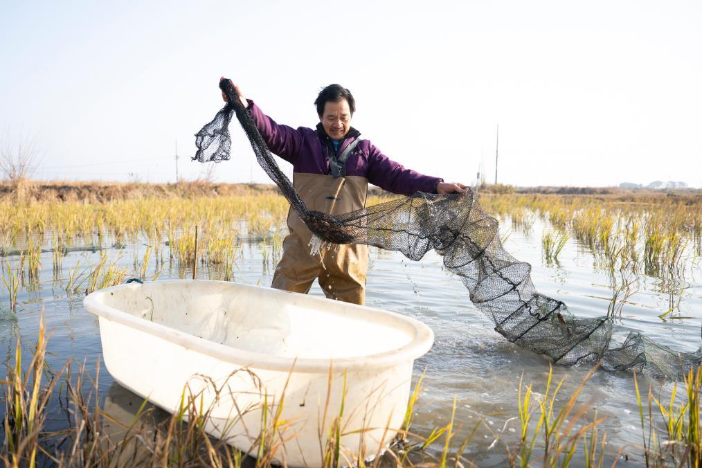 清晨5点,夜色尚未褪去,气温逼近零摄氏度。在潜江市积玉口镇凤蛟村8组,55岁的虾农刘开钧早早起床,套上下水服,踏进水田起笼捕虾。不一会儿,他就收获100斤小龙虾。拉到镇上后,很快被抢购一空。刘开钧说,他连着忙活10天,足足挣了2万元。