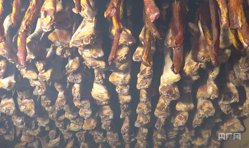 “我们坚持用传统柴火熏制,光熏制就要18到35天。”负责人杨曙指着墙上的温度计介绍。车间另一侧,工人们正忙着腌肉、包装,直播间里主播现场展示产品,后台打印订单的声音不绝于耳。
