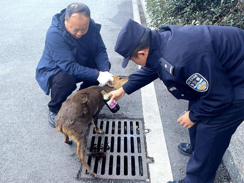 民警在救助小麂。