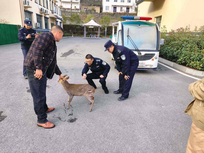 派出所民警第一时间联系湖北五道峡国家级自然保护区管理局。经工作人员现场辨认,确认这是一只成年雄性小麂,体重约35斤。推测其因夜间活动不慎误入居民区,导致背部和腿部受伤。民警在保护区工作人员的协助下,细心为小麂清洗伤口、消毒上药,并对其进行了半天的观察与照料。