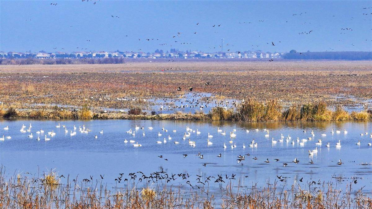 每年秋冬,洪湖湿地都会迎来一群远道而来的“客人”。今冬以来,这里已记录到水鸟38种、总数超过7万只,其中国家一级保护动物白鹤、青头潜鸭等珍贵身影频频出现。