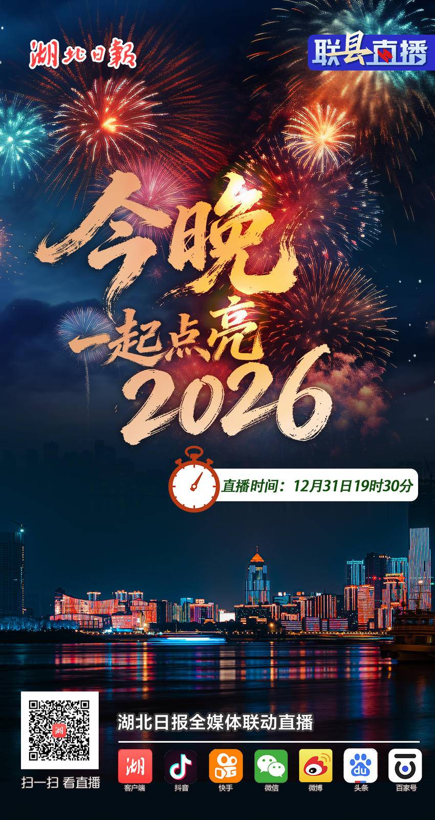 2026年的钟声即将敲响,荆楚大地的跨年盛宴已就位,正等你赴约!今晚7点半,锁定湖北日报的直播间,多机位全景呈现、主播实时互动,带你沉浸式云打卡荆楚各地的团圆氛围与新年祝福瞬间,一起告别2025,点亮充满希望的2026!