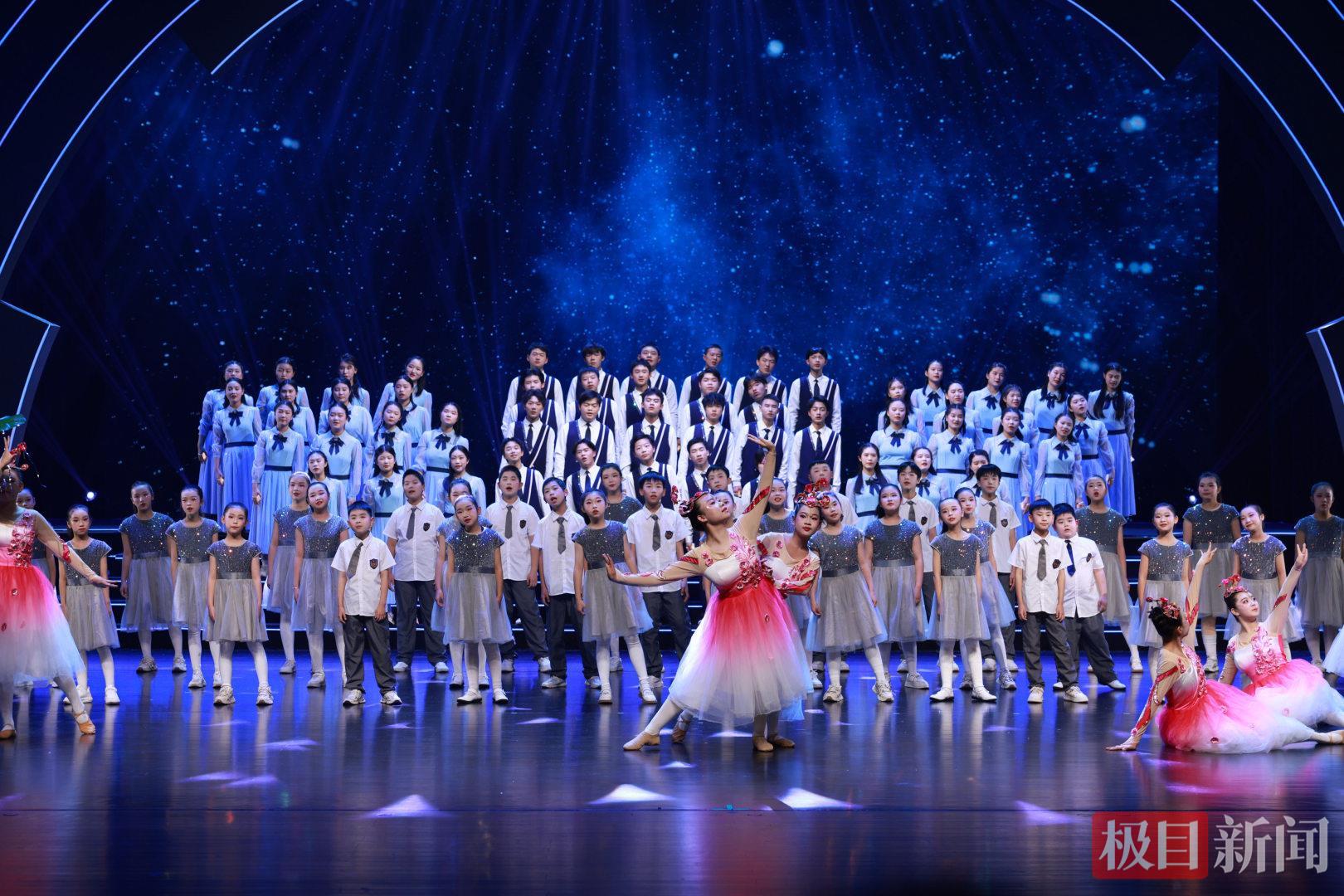 展演在观众步入主会场前便已开始。从广场至前厅,《入鄂雅集》流动舞台上的学生用青春舞姿迎宾。主会场内,29个精品节目以“春萌成长”“绽放筑梦”“远航星河”三大篇章循序展开。合唱《玉盘》充满生机,舞蹈《花湖之翼》以刚健舞姿演绎花湖机场的腾飞气象,《一条大河》则用彩扇演绎出深沉的家国情怀,完整呈现了孩子们从汲取滋养到立志未来的心灵成长轨迹。