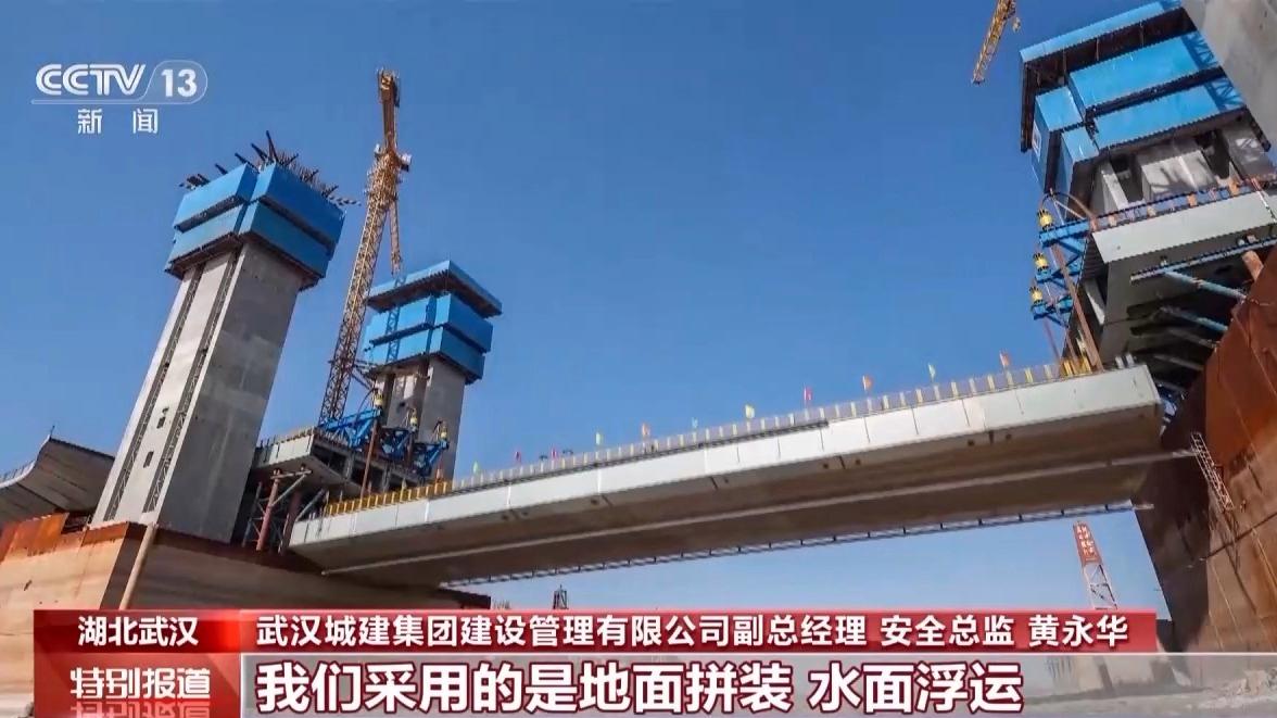 武汉城建集团建设管理有限公司副总经理 安全总监 黄永华:因为工业港比较狭窄,无法采用大型浮吊的设备进行拼装,我们采用的是地面拼装、水面浮运,整体吊装拼接,从水面直接提升21米高进行合龙。