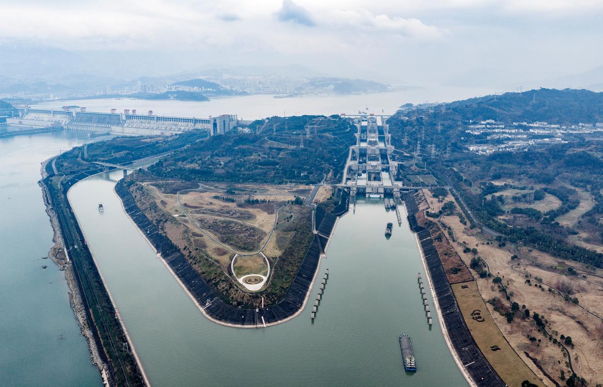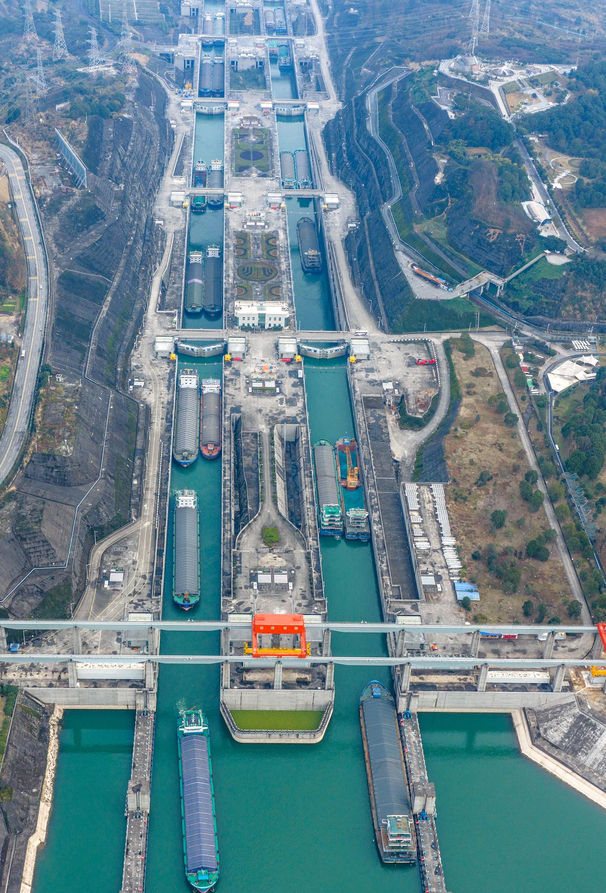 2026年1月1日,在湖北省宜昌市,船舶有序通过三峡双线五级船闸(无人机照片)。新华社发(王罡摄)