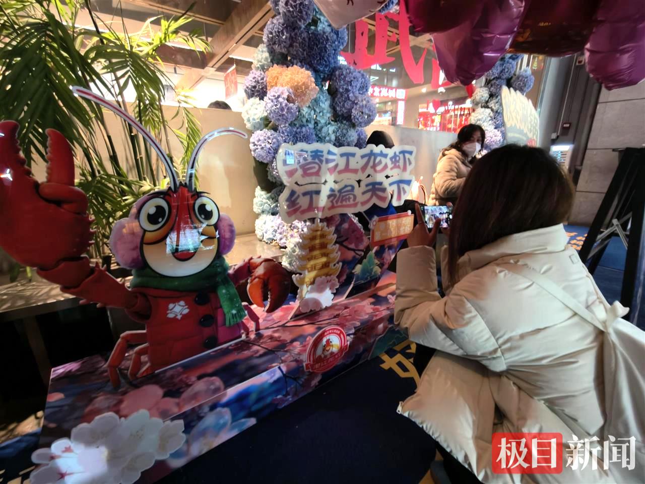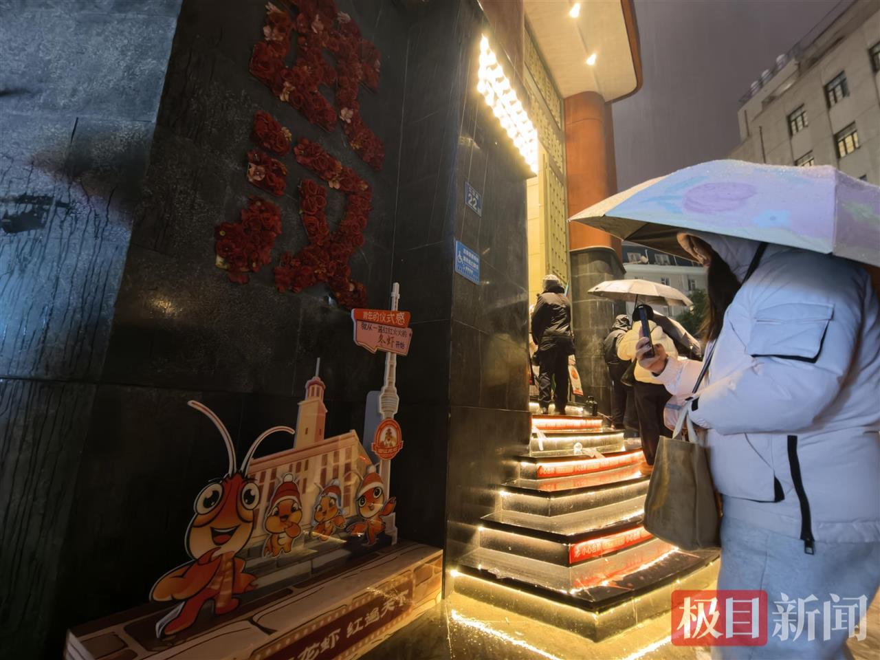 当晚,在位于江汉路核心区域的肥肥虾庄江汉路红房子店附近,潜江龙虾冬季主题打卡装置正吸引着不少游客拍照留念。同时,位于江汉路的靓靓蒸虾江汉路汉口STAY店附近,潜江龙虾冬季主题打卡装置就位于门口的花丛之中,与店面相得益彰。