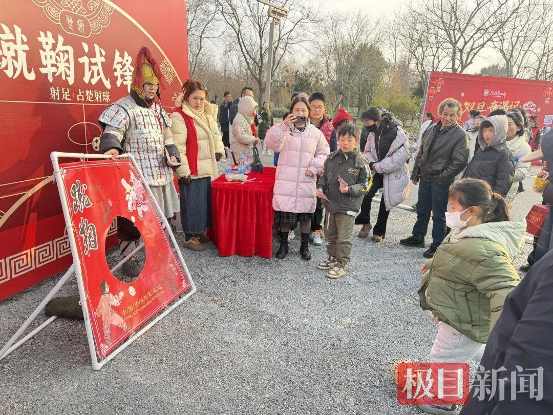 在日间活动现场,投壶、射箭、蹴鞠、楚谜、棋局等18项楚风竞技游戏吸引了市民和游客参与。参与者在“楚国竞技场”尽情体验传统运动的乐趣,不少家庭与朋友组队互动,欢笑声、助威声此起彼伏。