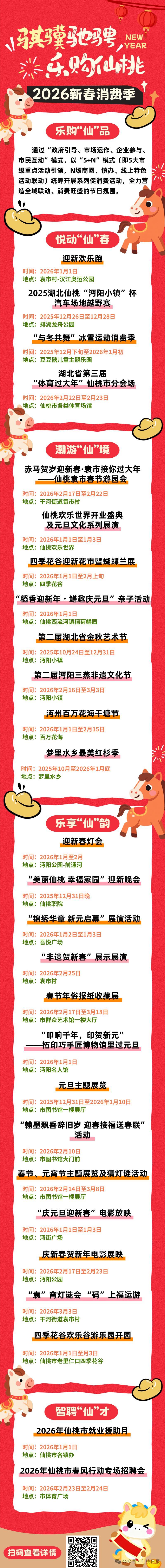 花式迎新,2026新春消费季活动将持续3个月,贯穿元旦、春节、元宵等特色节点,通过串联乐购“仙”品、悦动“仙”春、潮游“仙”境、乐享“仙”韵、智聘“仙”才五大版块,覆盖全城全域、联动重点商圈、丰富消费场景,打造惠民迎新消费盛宴,点燃市民消费热情,让整个新春“热力”十足。