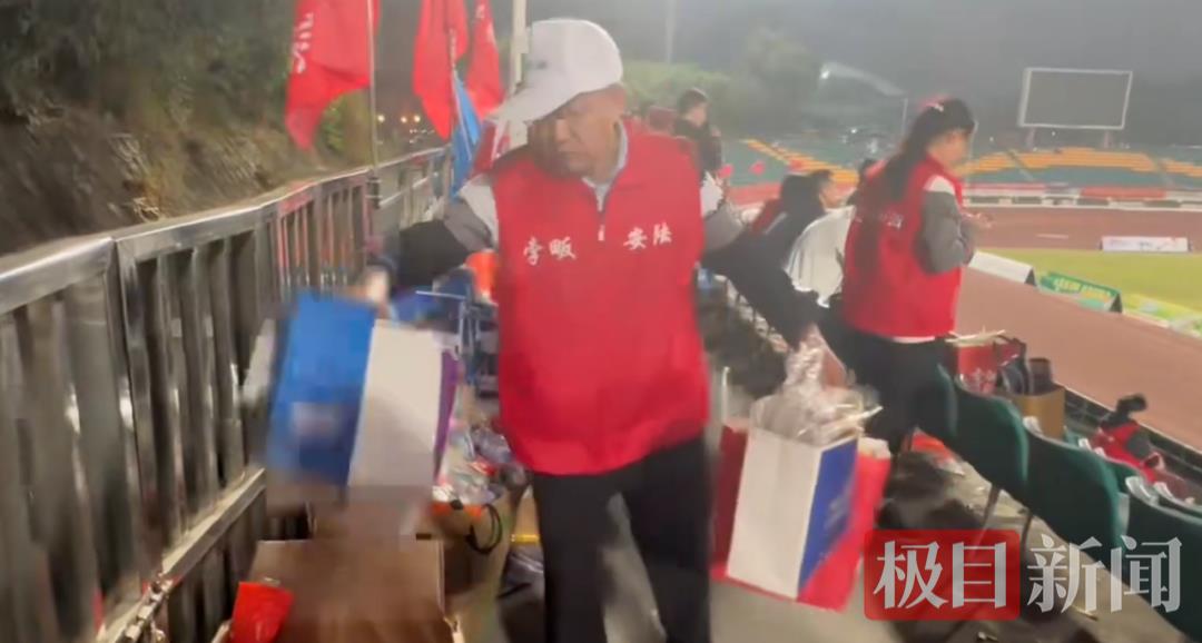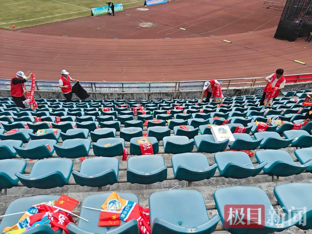 比赛结束,欢呼渐歇。当大部分观众开始离场时,一些身着安陆乡超助威服的球迷却选择留了下来。他们三两一组,自然地弯下腰,开始清理自己及周围座位下的矿泉水瓶、零食包装和加油棒。