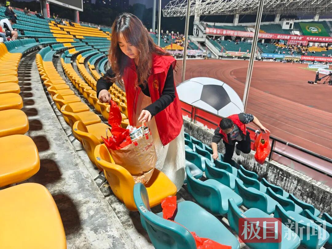 没有组织,没有号召。一些正准备离开的深圳本地观众,见状也停下脚步,加入了清理的行列。
