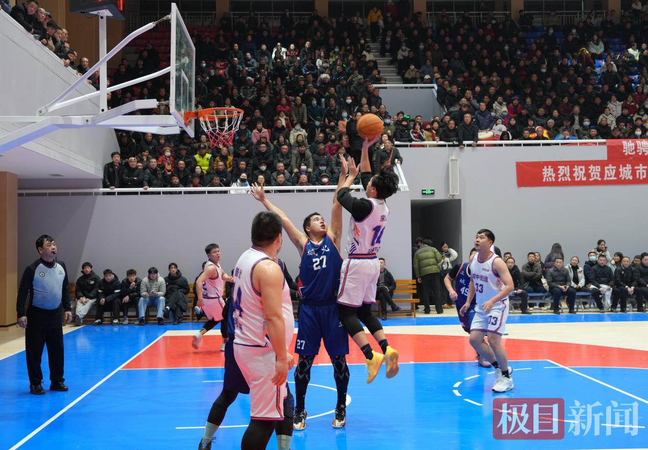 1月5日晚,应城市体育馆内篮球决赛气氛热烈。决赛现场,球权三次易手,篮下对抗激烈。快攻反击接连上演,城中35号选手在双人封堵下后仰跳投,篮球在筐沿颠了两下,应声入网,引发现场一片欢呼。