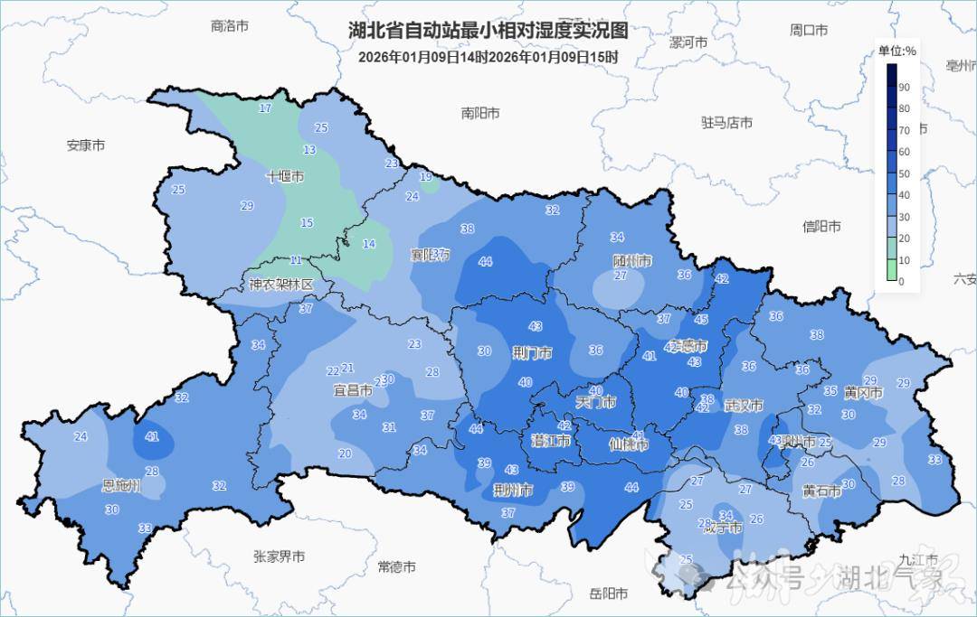 与晴暖相伴的是显著的干燥感,9日下午3时,湖北大部地区相对湿度在40%以下,鄂西北局地不足20%。虽然天气晴暖,但周六将有一股弱冷空气影响湖北,风力明显增强,偏北阵风可达5到7级,外出要务必注意防风,小心高空坠物。