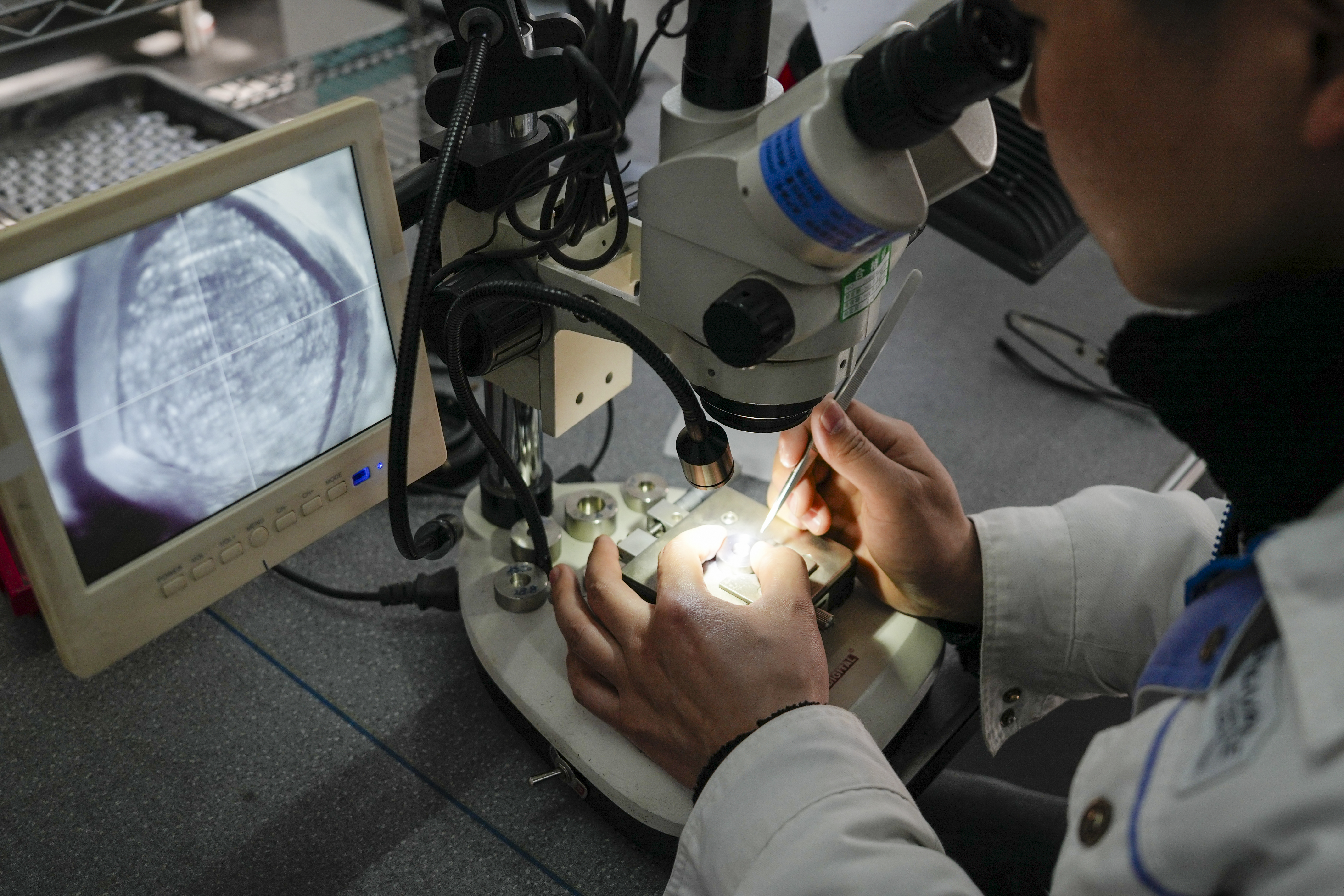 给立金刚石工业工人在镶套金刚石。 (湖北日报全媒记者 夏晓君 摄)