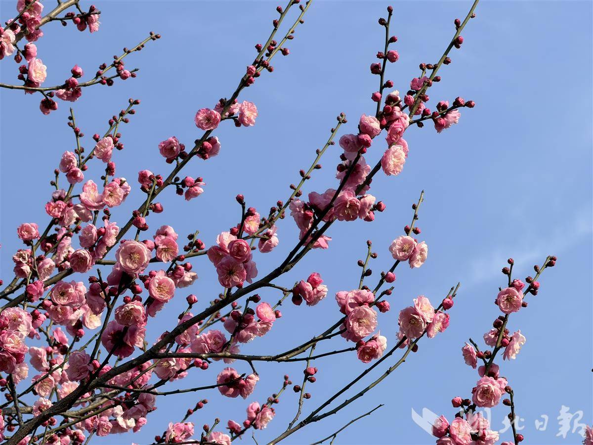 记者踏上缓坡,越往坡顶走,人气越旺,花香愈浓,蜜蜂翻飞于花枝之间。这片占地约8000平方米的坡地上,栽植着红梅、宫粉梅、绿萼梅、白梅等四个品种共500余株梅树。坡顶北侧光照充足,上百株红梅与宫粉梅已竞相开放,汇成一片绚烂的“粉色云霞”,与南侧尚在蓄蕾、点点白梅吐蕊的静谧景象相映成趣。