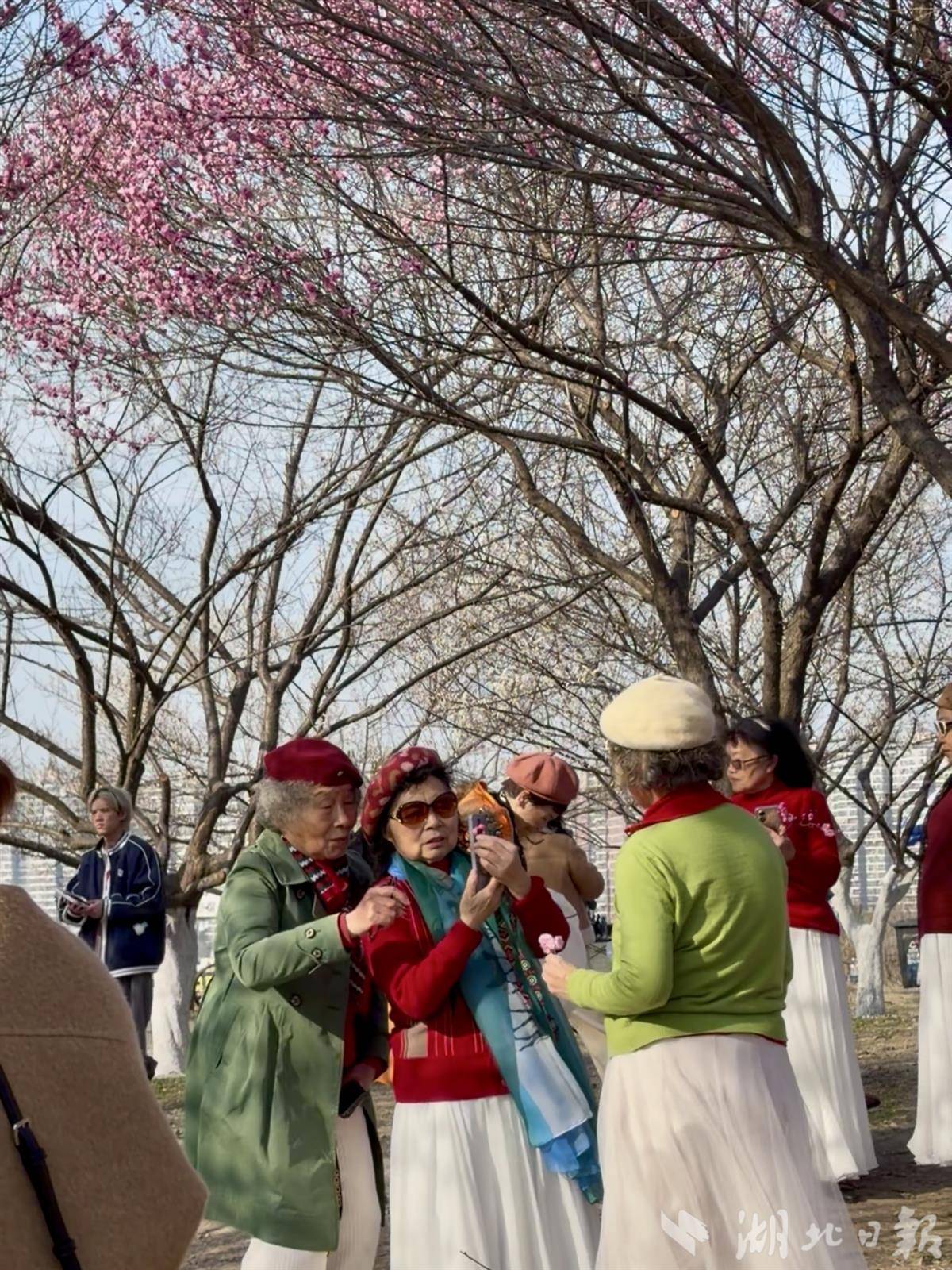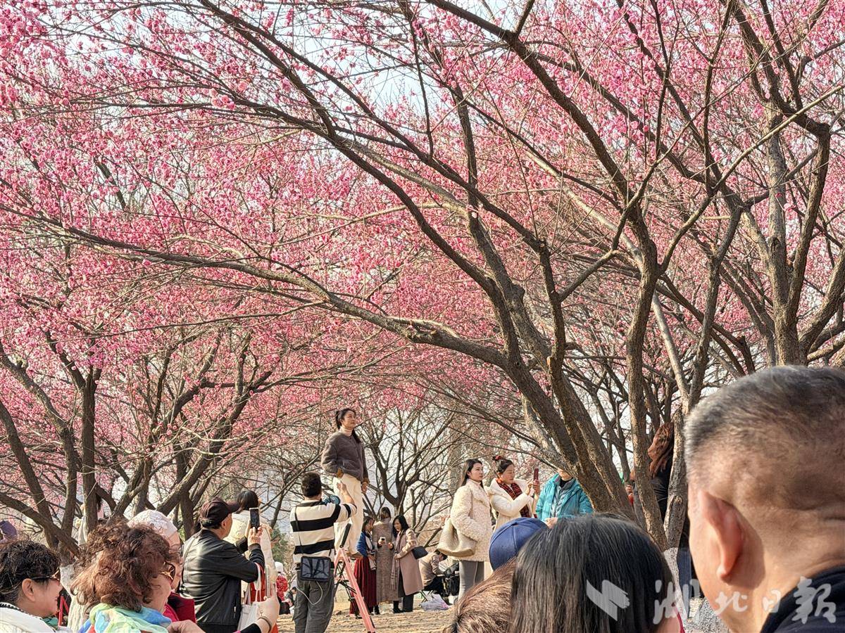 虽是工作日午后,坡上已有数百位市民游客漫步赏玩。花影人潮中,除了专程而来的摄影爱好者架起“长枪短炮”,更有许多家庭扶老携幼,在梅林间游玩、野餐。“花期比往年早了近一个月,好几个周末的‘约拍’都排满了。”摄影爱好者周女士边调整镜头边说。据摄影师“四叶草”介绍,周末这里人流如织,即便今天是工作日,前来拍照的游客依然不少。“目前‘梅花坡’花开得最盛,大家都抢着来出片,竞争压力不小。武汉春赏樱、夏看荷、秋品桂、冬观梅,四季都有拍摄主题,眼下的梅花是开年第一波热度。”