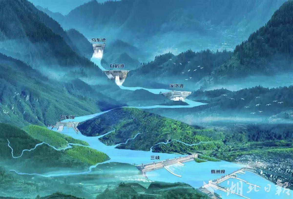 在这条“走廊”里,六座大型水电站呈梯级排布,实现“一滴水发六次电”。据测算,1立方米的长江水流过三峡大坝,能发电0.25千瓦时,在走廊中多次做功,发电量可达2千瓦时。