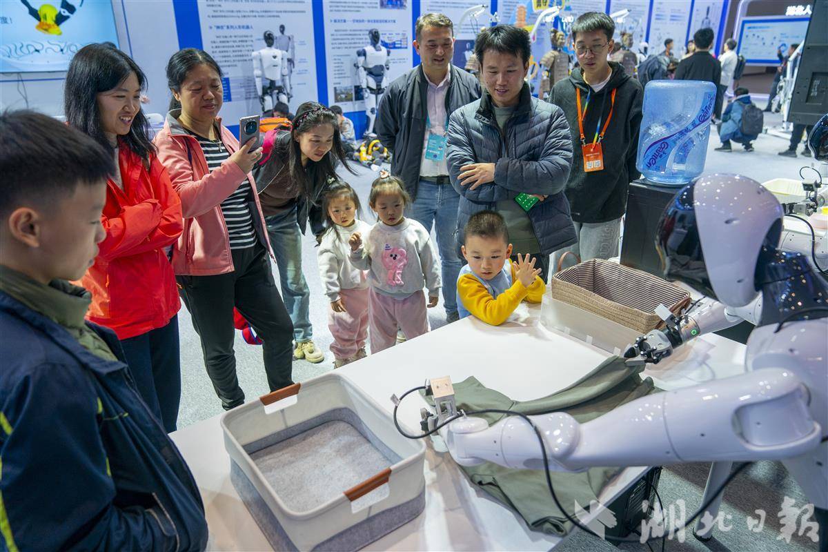 2025年11月22日,中国光谷科技会展中心,观众在湖北人形机器人创新中心展台参观,并与各种应用机器人互动。当日,2025中国5G+工业互联网大会在武汉开幕。(湖北日报全媒记者 魏铼 摄)