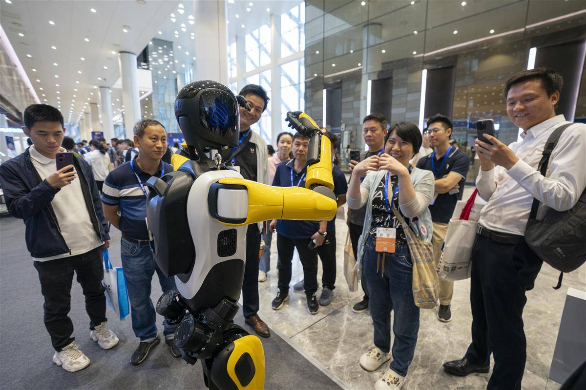 第二十届“中国光谷”国际光电子博览会,人形机器人在现场与观众互动。(湖北日报全媒记者 魏铼 摄)