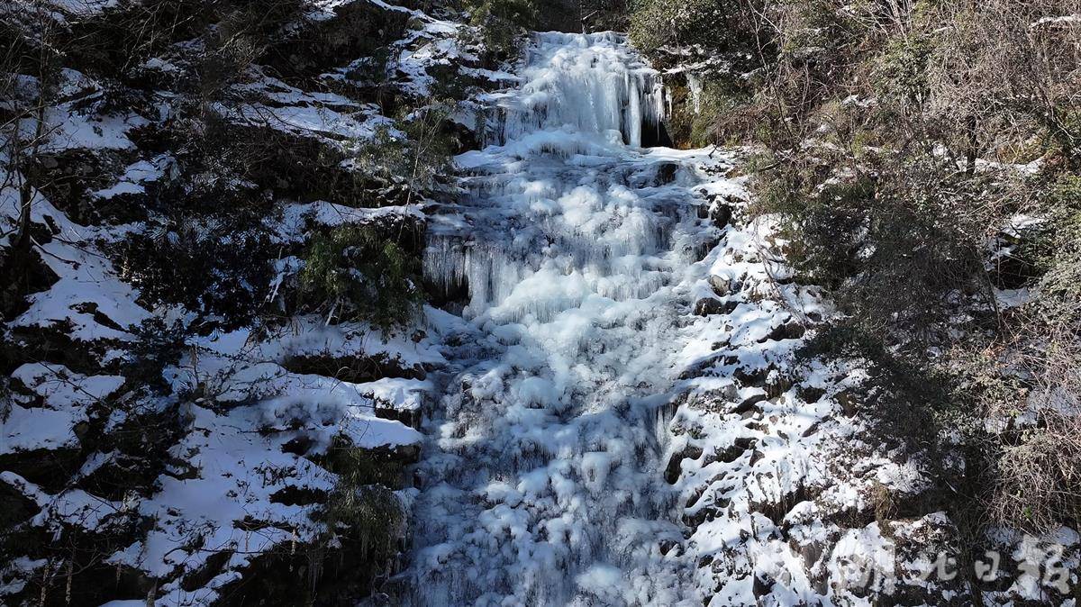 站在百米落差的冰瀑下仰望,犹如雪白的锦缎顺着山崖铺展而下,藏在冰层下的潺潺细水若隐若现。阳光穿透山林映照在冰瀑上,层层叠叠的冰晶闪烁着淡蓝色微光。