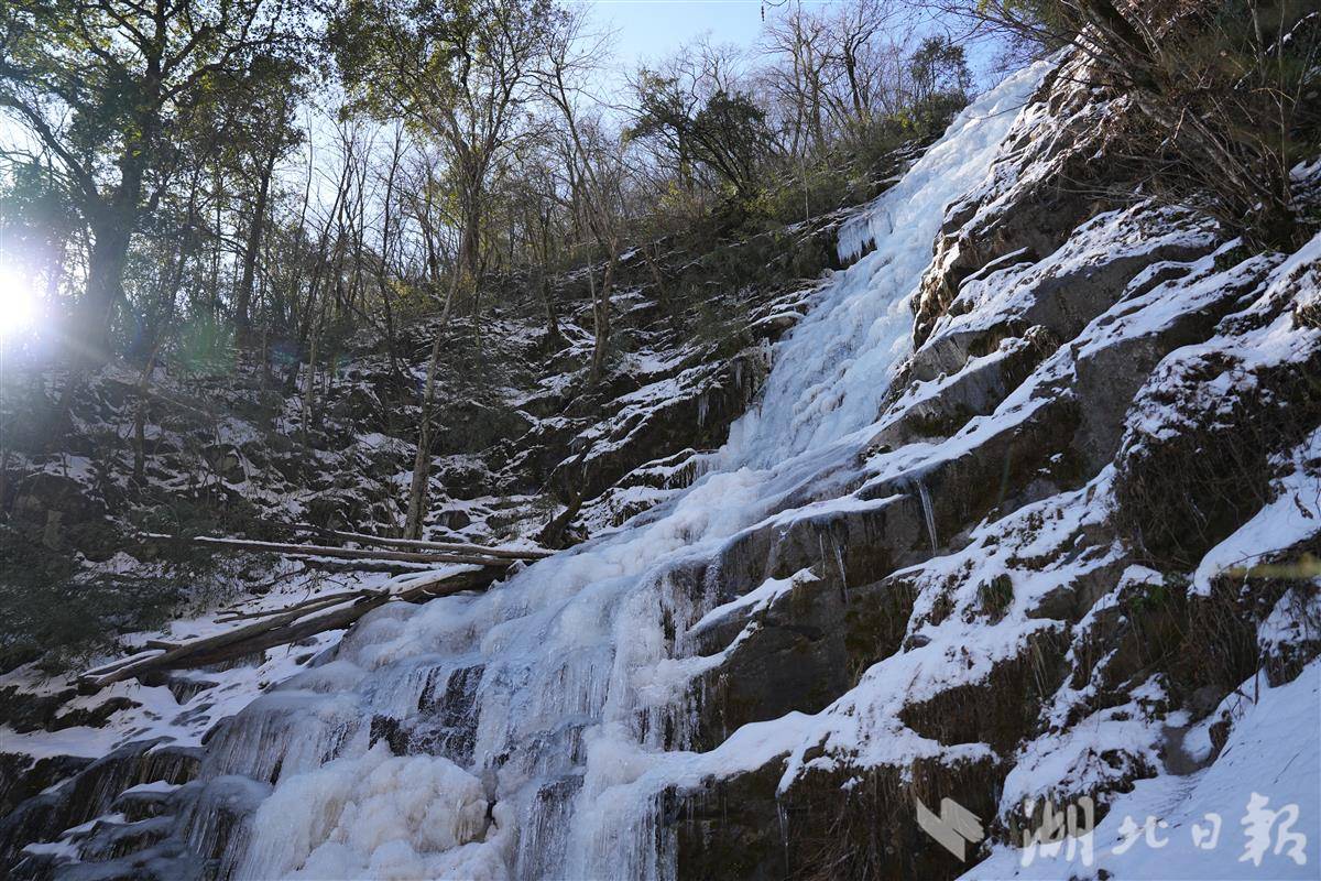 1月7日,海拔1200米的竹溪县营盘山生态旅游景区,气温零下8℃。湖北日报全媒记者穿上“冰爪”防滑鞋套,耗时约30分钟,登上了海拔1500米的冰瀑所在地。一路上,攀山步道被冰雪覆盖,山间溪流渐渐成冰。