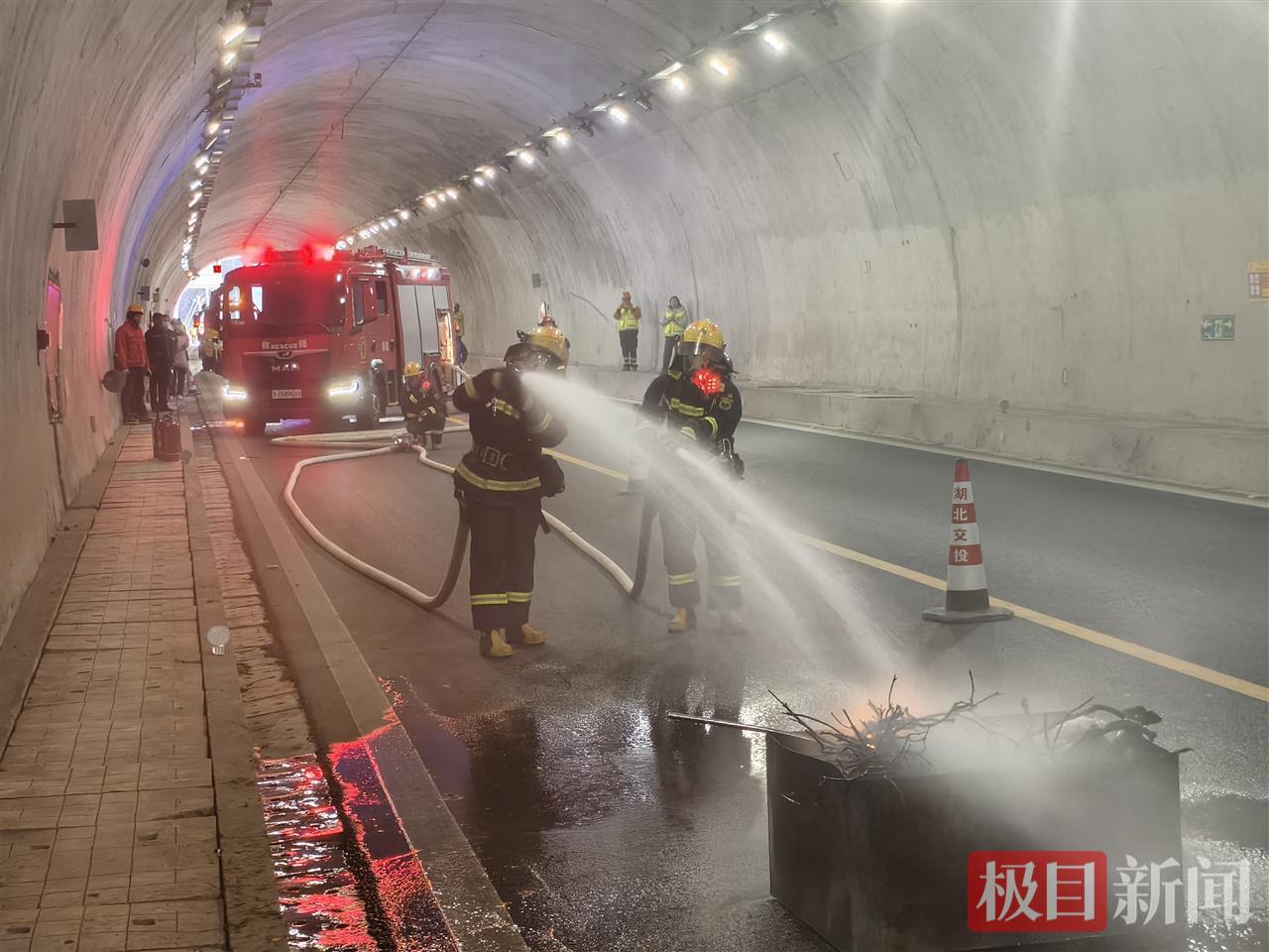 16时03分,高速交警率先抵达现场,精准实施交通管制与远端分流,开辟救援通道。路政人员同步抵达,协助封闭管控。16时05分,消防救援与医疗救护组抵达核心区域。消防员沉着开展火情侦查,快速建立水枪阵地,对模拟火源实施扑救;医护人员同步对模拟受困“伤员”进行紧急处置、评估及转运。16时15分经强效扑救,明火被完全扑灭。消防队员随即对起火区域进行持续冷却,严防死灰复燃。第七综合巡检办快速集结清障及机电维护力量,在确保环境安全后高效拖离“事故车辆”,并立即对隧道照明、通风、消防管线等关键设施进行检查修复,确保正常运转。16时30分,经现场联合检查确认,所有隐患均已清除,满足安全通行条件。交通管制有序解除,信号灯与情报板恢复正常状态,演练圆满结束。