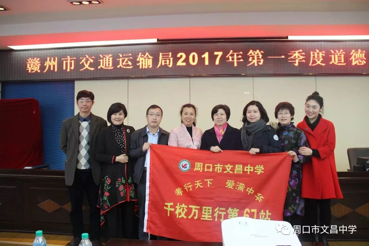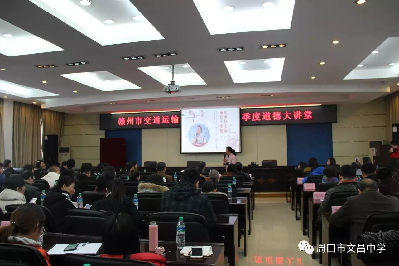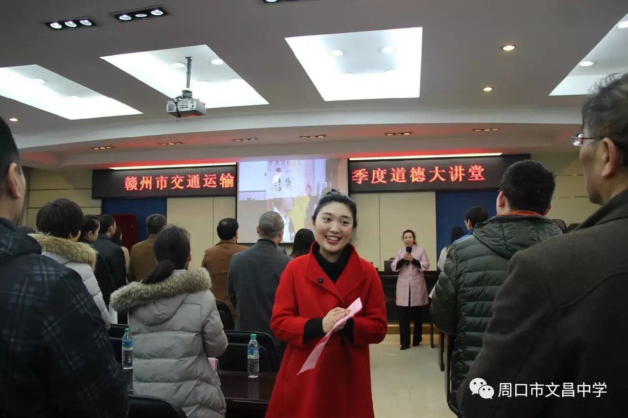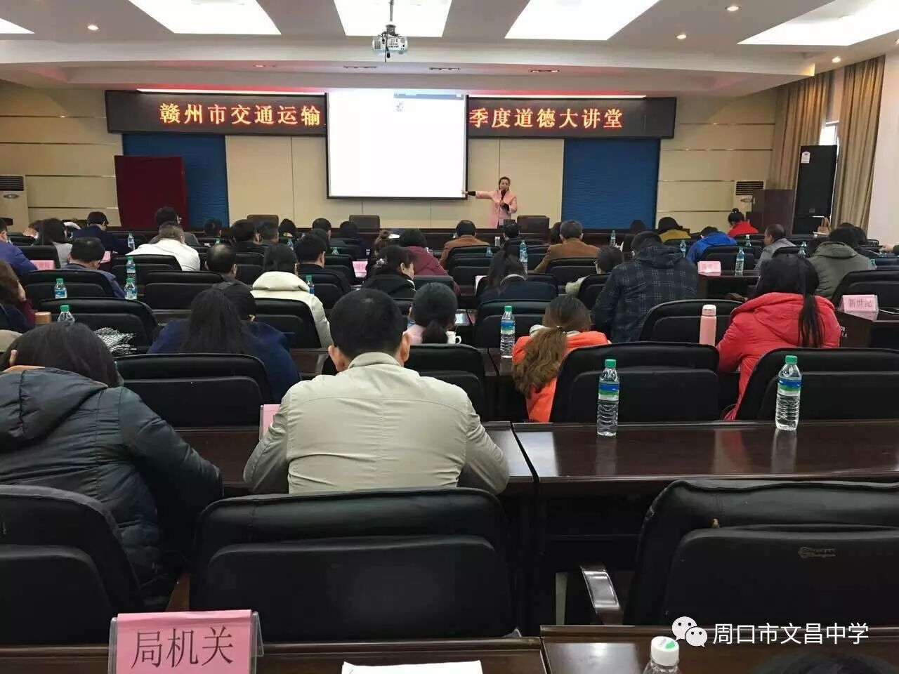 3月22日,周口市文昌中学宣讲团应赣州市交通运输局的邀请,做了一场“传承好家风,涵养正能量”的讲座。活动组织有序,主持特有新意。市妇联主席廖丽萍、副主席罗云、市纪委纪检组长邓小荣、局机关党委副书记张慧、局文明办常务主任谢小明、明德传统文化传播中心主任江少清,以及各党组负责人、各单位分管精神文明工作的领导参加了会议。