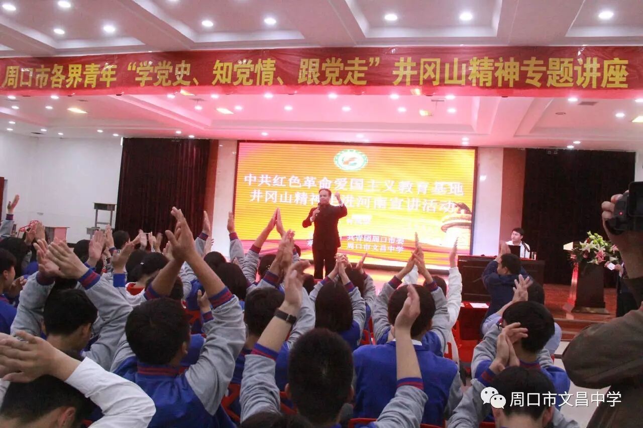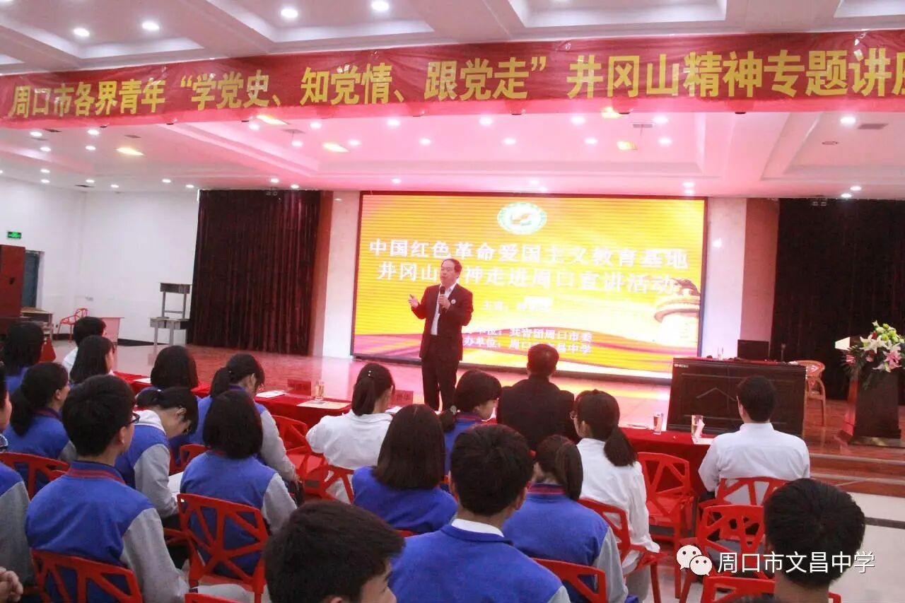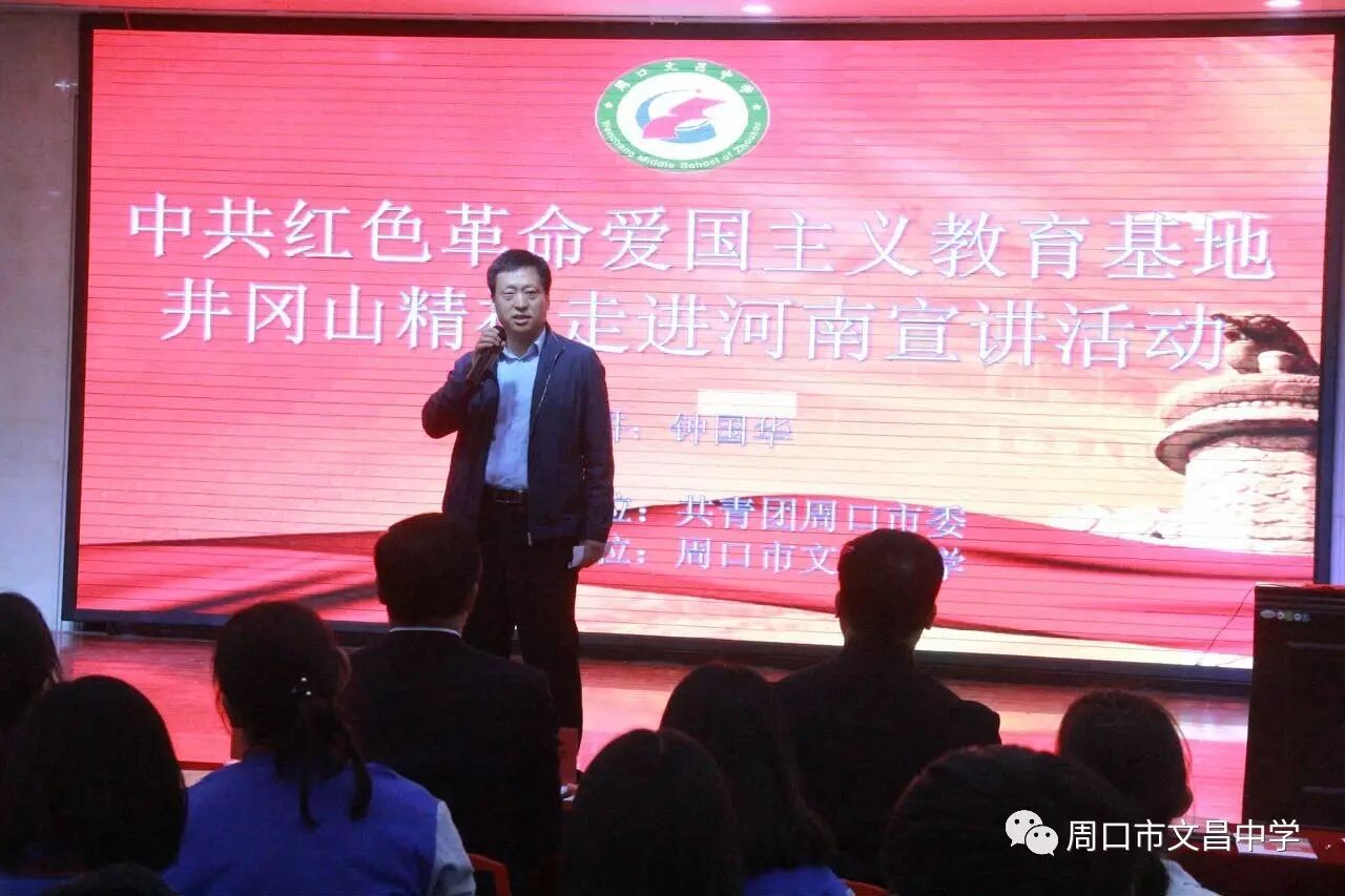 4月27日,中国红色革命爱国主义教育基地井冈山精神进周口宣讲活动在文昌中学举行,团市委副处级纪检员杨朝晖、团市委学校部部长马仁灵、团中央井冈山教育基地宣传推广处联络部副部长江龙出席活动。