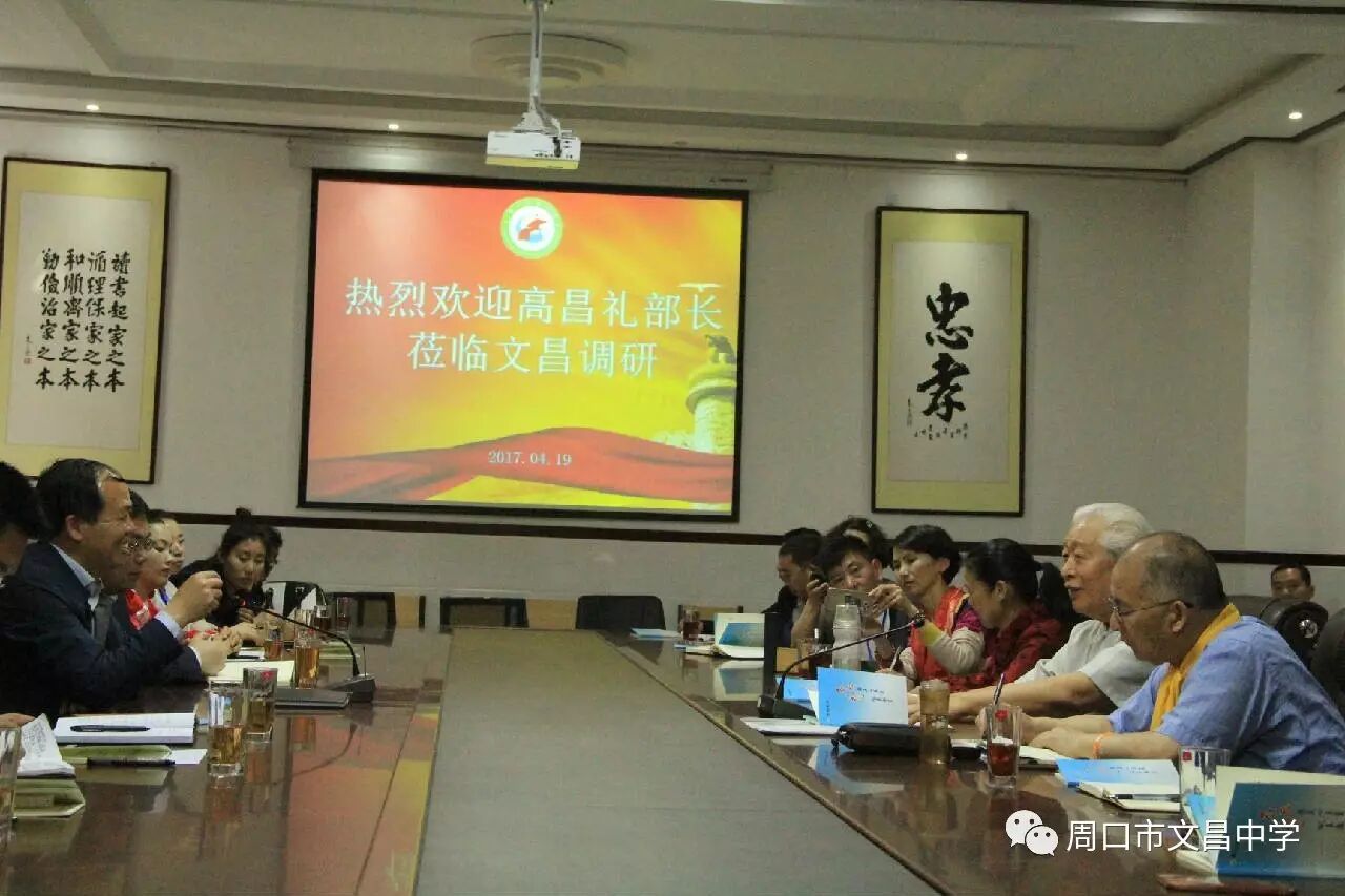 高昌礼部长重点询问了学校在推行传统文化进校园过程中遇到的困难和阻力,他说,传统文化进校园,名为传统,其实是创新的过程,既要传承,又要创新形式和方法,还要取得社会各方面的认同,对学校来说是个不小的考验,文昌中学短短三年取得如此的成绩,来之不易,难能可贵。在听到文昌中学的家委会建设深入实施,实现了学校后勤家长社会化时,他连说三个“好”字。对于文昌中学的办学理念、校风校训、国学“12.3”工程、“三香教育”、感恩教育、国学诵读、家校共建等,高昌礼部长表示出浓厚的兴趣,进行了详实的记录,并时不时的询问实施的细节、在推行传统文化过程中出现的问题及解决办法。朱贵华校长讲述了建校的困难、走餐厅之路的艰辛、诚信货架建立的步履维艰,高昌礼部长多次鼓掌,赞赏文昌中学的创新管理和责任担当。