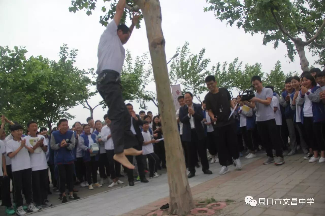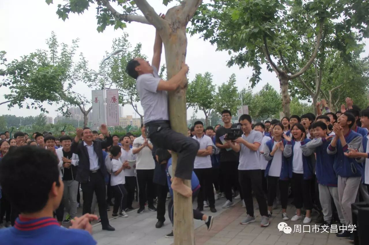 2017年5月11日,八年级学生在杨帆主任的带领下以身示范举行颠覆我们思想的爬树比赛。年轻教师代表王俊召、马强、家委会钱玉华纷纷摩拳擦掌,爬树助兴。