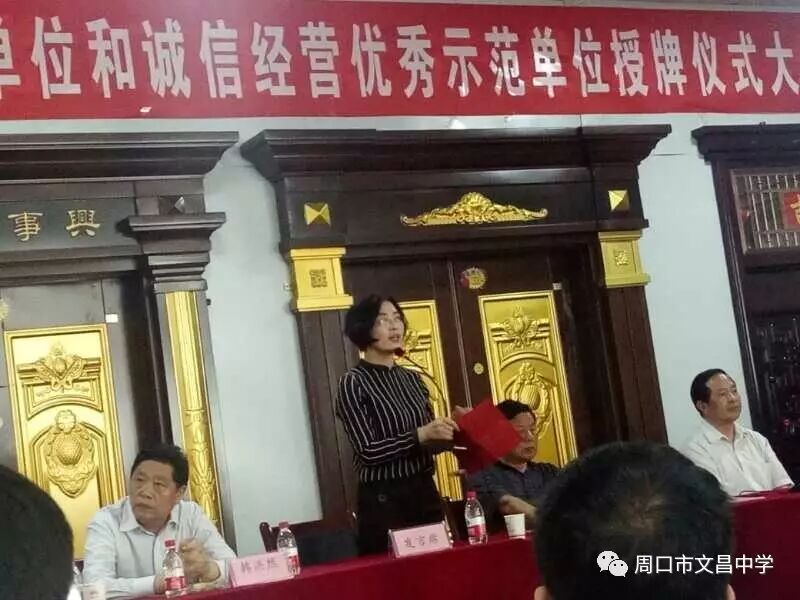 本次会议授予周口市文昌中学等12家为信用建设优秀示范单位,石敬平主席亲自颁奖,朱贵华校长代表文昌中学受奖。文昌中学朱艳丽主任受校长委托代表优秀示范单位分享发言。